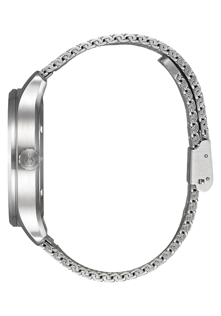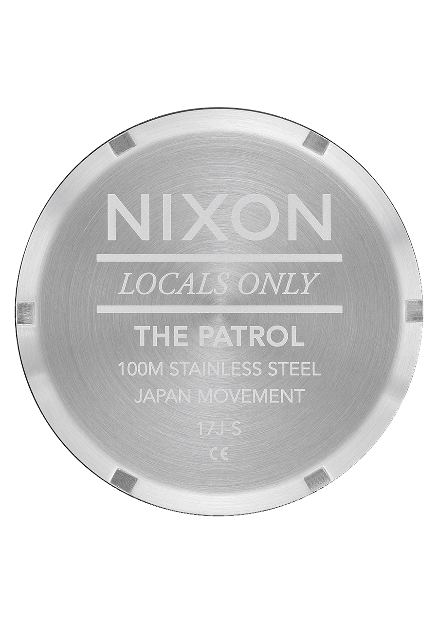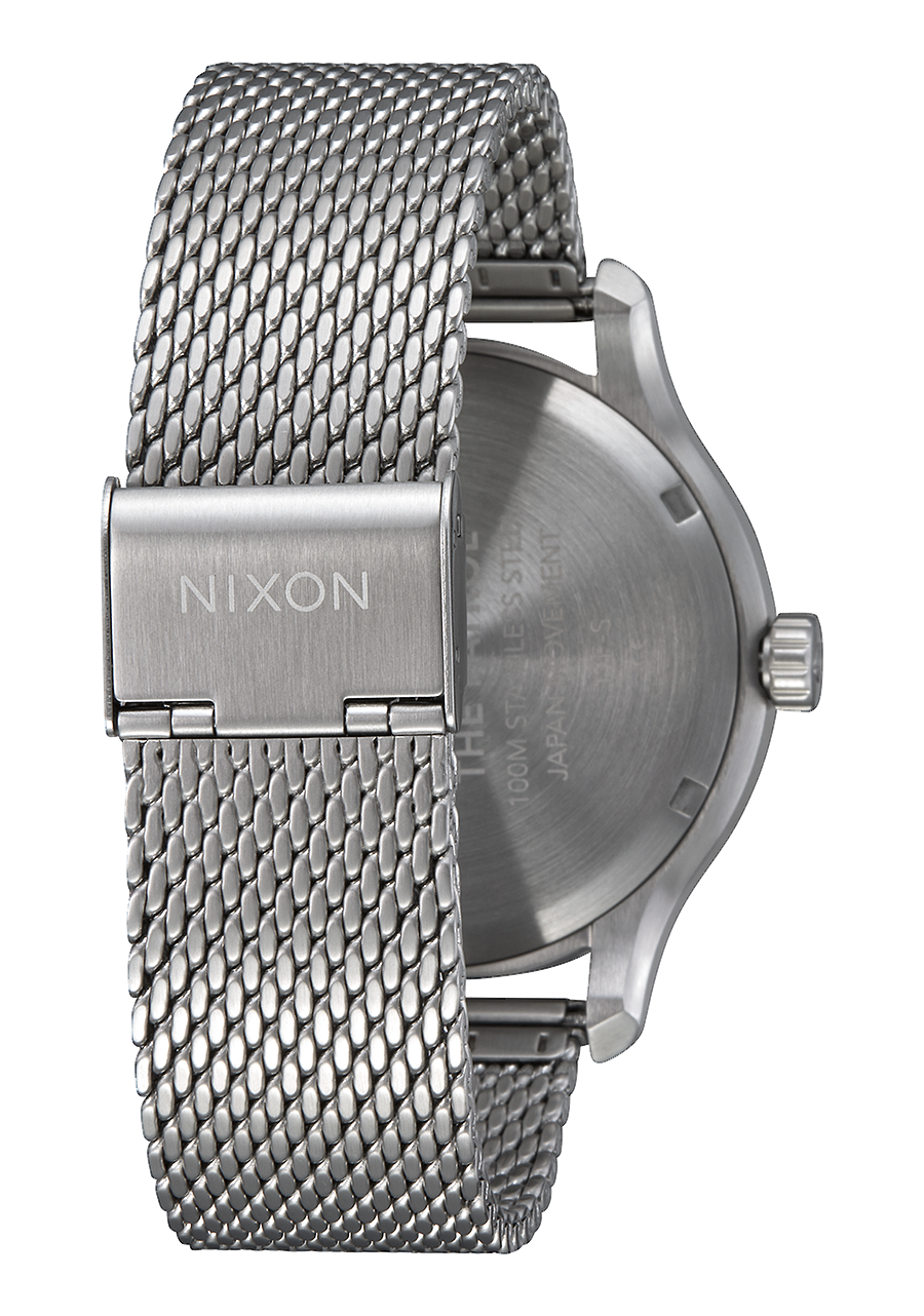 Features surf-standard 100m waterproof rating, custom, solid stainless-steel case, and hardened mineral crystal.